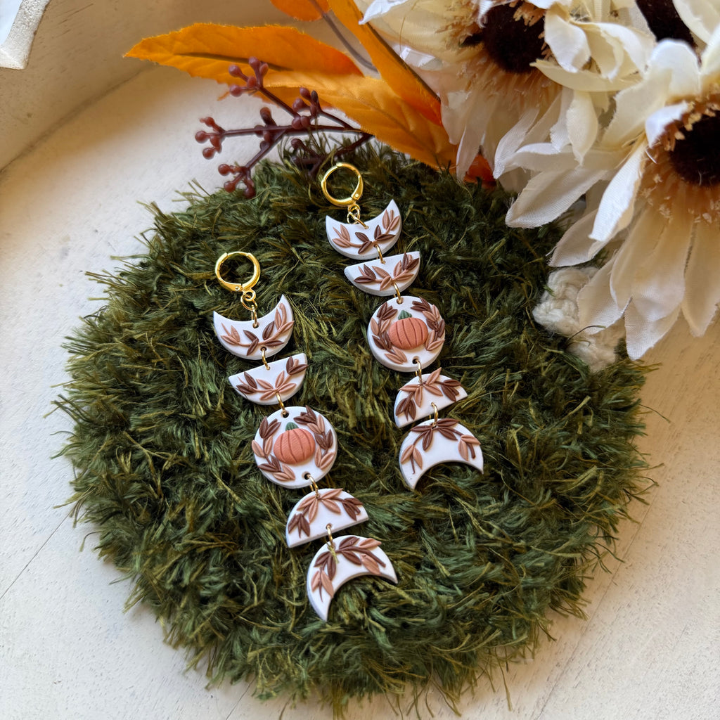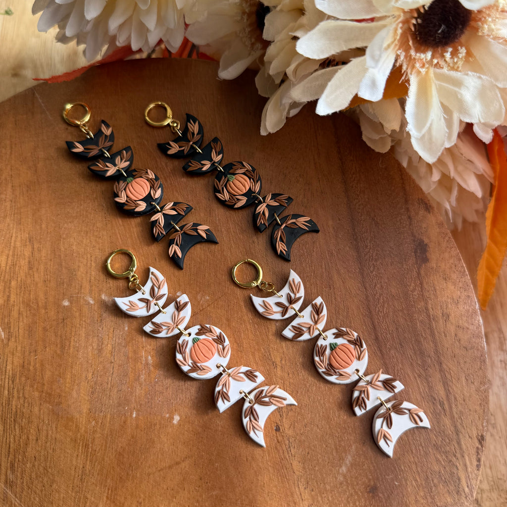 Make a statement this fall with our Pumpkin Moon Phases earrings! Handmade with lightweight clay, these fall-themed earrings feature a pumpkin, moon phases, and fall leaves, adding a touch of autumn to any outfit.