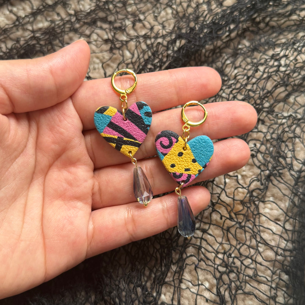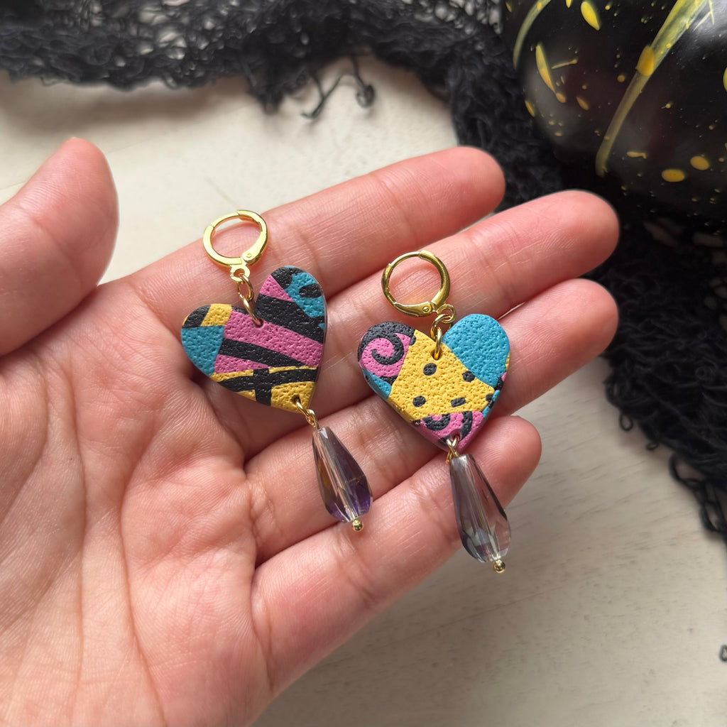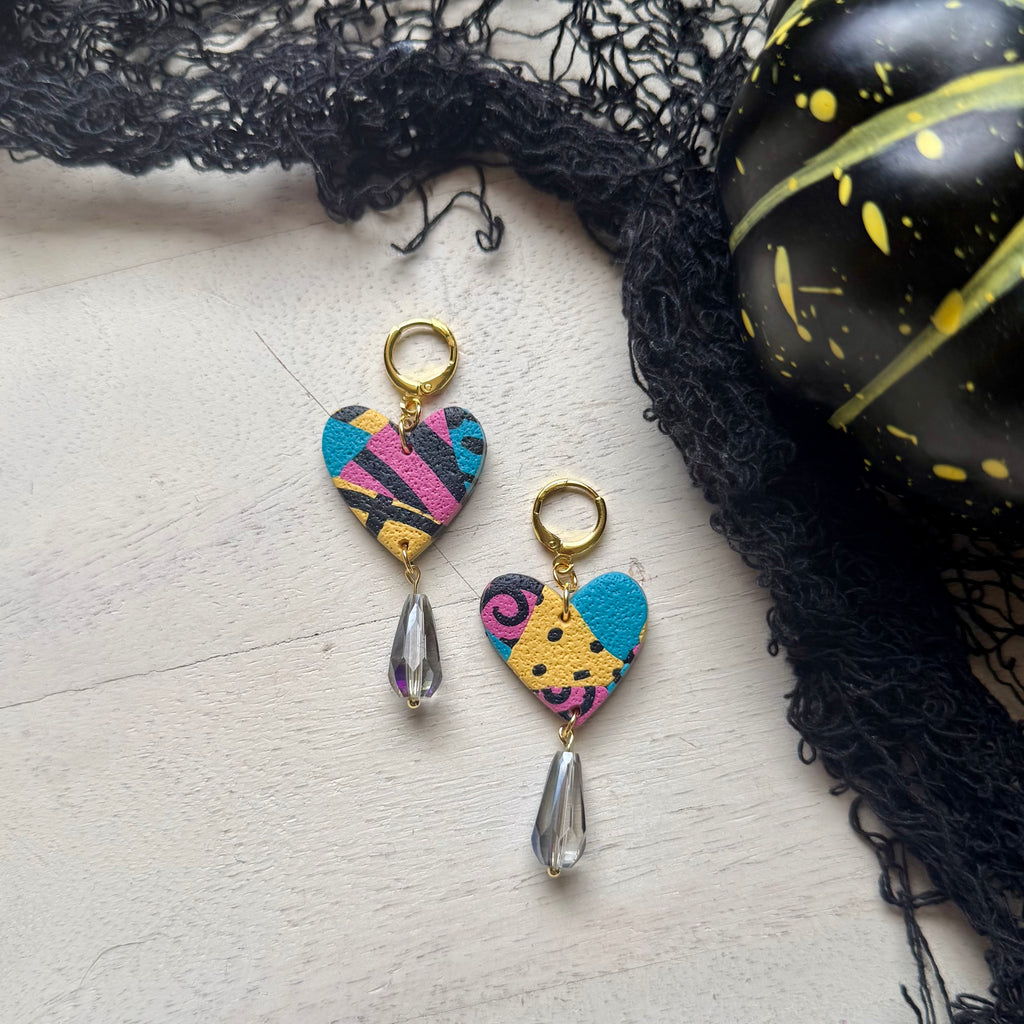 Celebrate Halloween with these handmade clay earrings inspired by a beloved classic. Featuring large heart shapes adorned with a charming bead, they blend cute style with a nostalgic tribute. Perfect for adding a playful yet meaningful touch to your spooky season look.